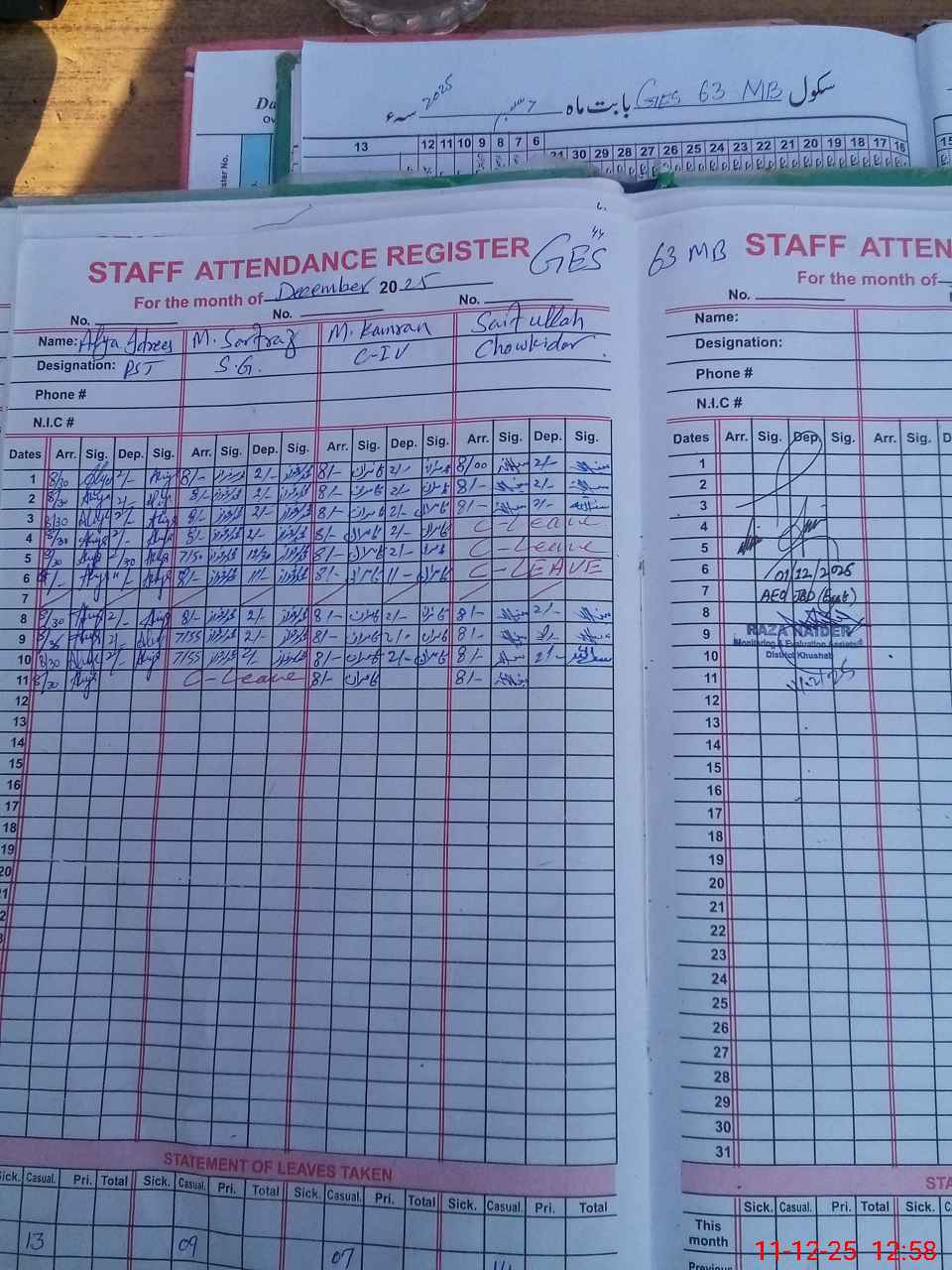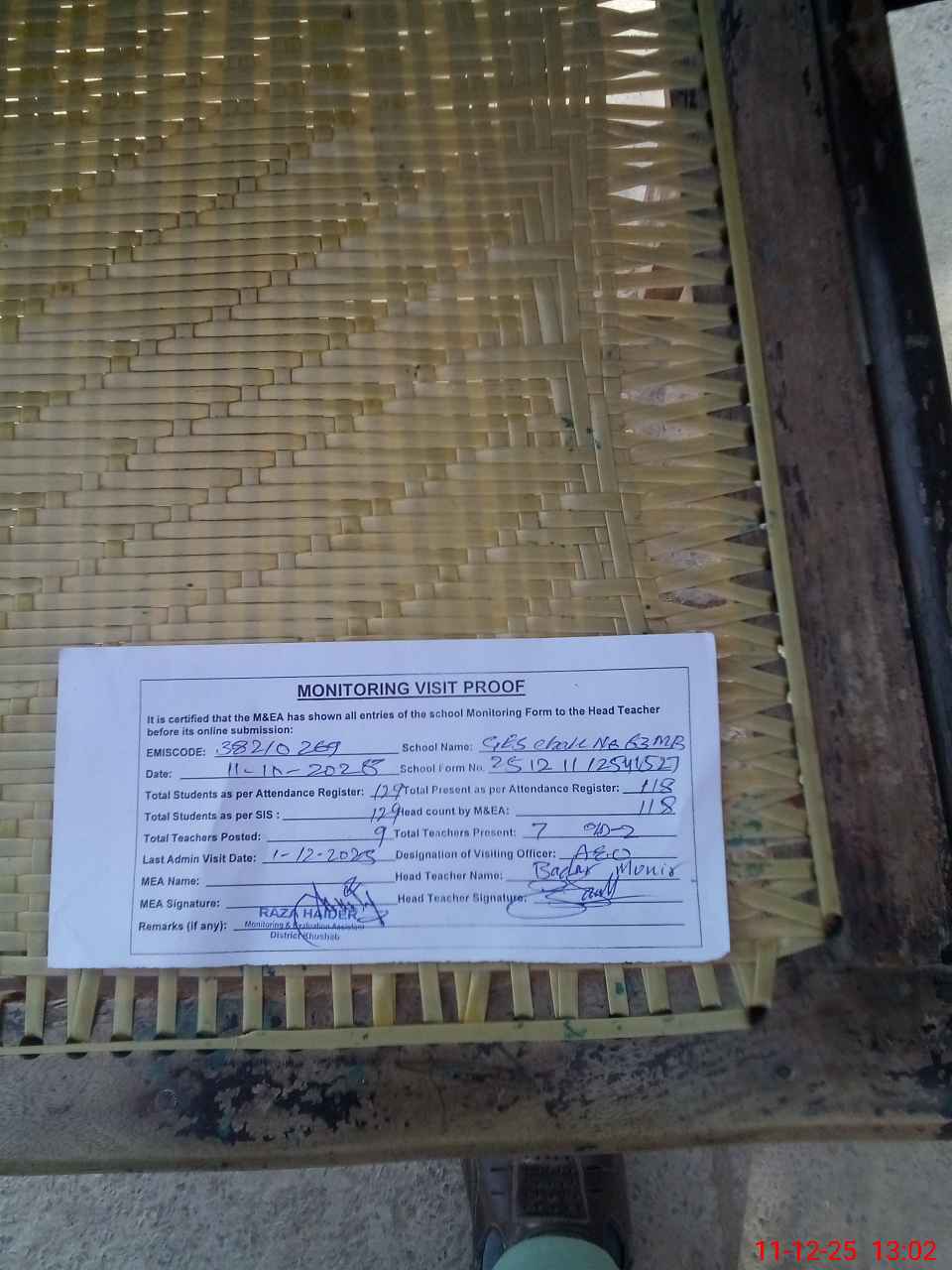| Attendance Register | Head Teacher | MEA with School | Visit Proof |