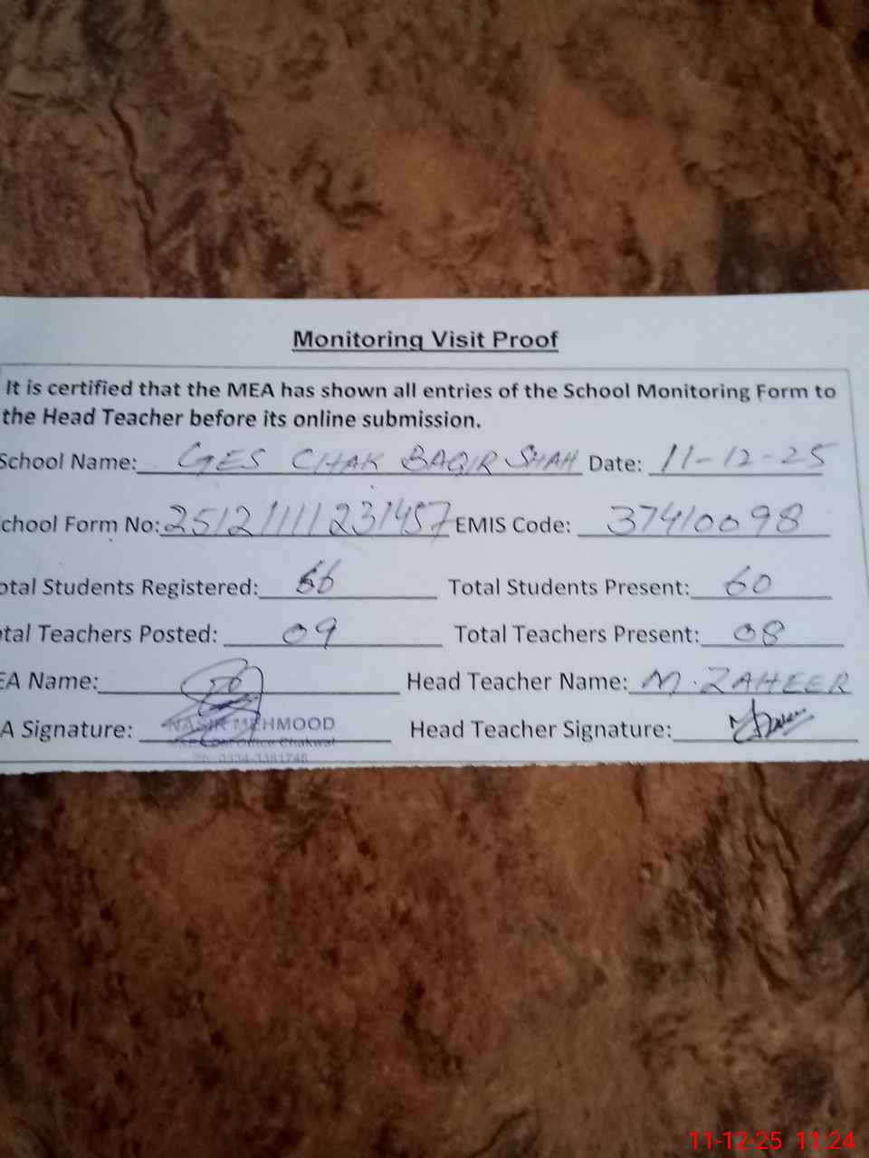 | Attendance Register | Head Teacher | MEA with School | Visit Proof |