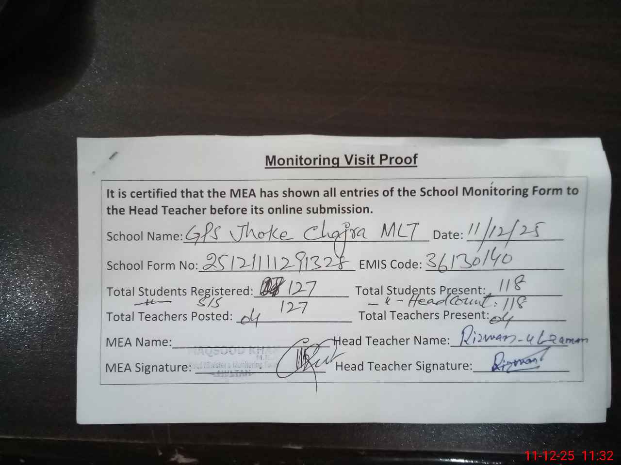 | Attendance Register | Head Teacher | MEA with School | Visit Proof |