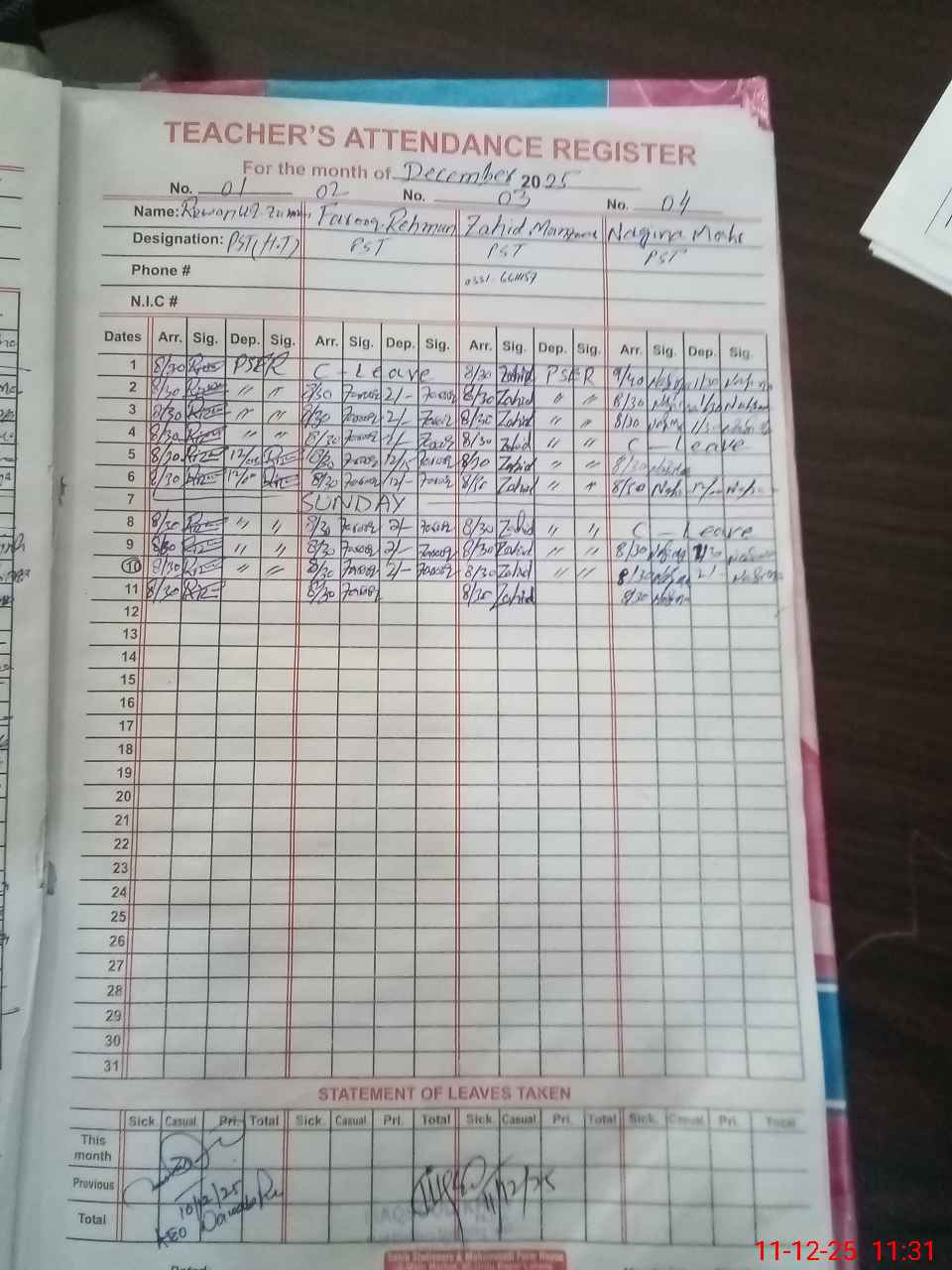 | CNIC | Full Name | Designation | R/C | Absence During Last Calender Month |