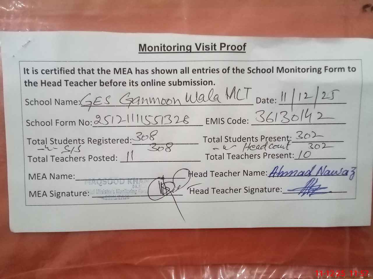 | Attendance Register | Head Teacher | MEA with School | Visit Proof |