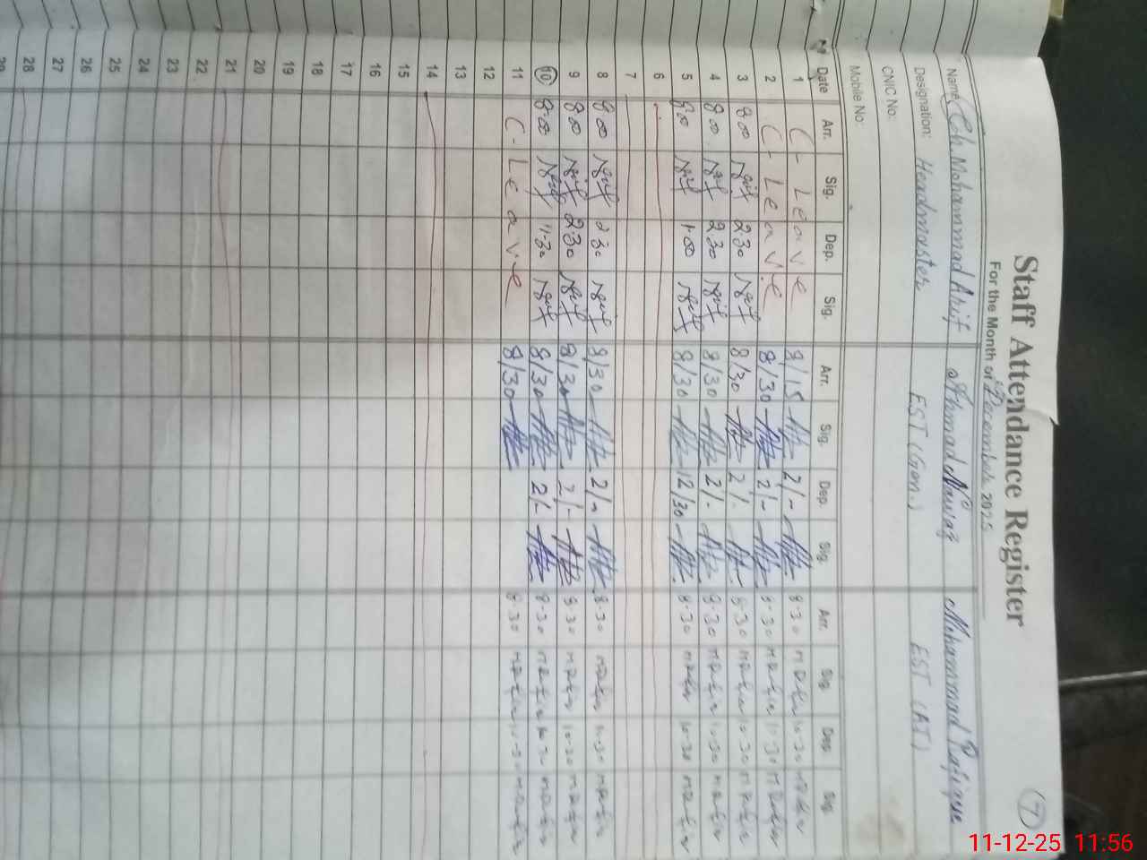 | CNIC | Full Name | Designation | R/C | Absence During Last Calender Month |