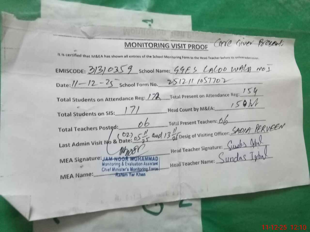 | Attendance Register | Head Teacher | MEA with School | Visit Proof |