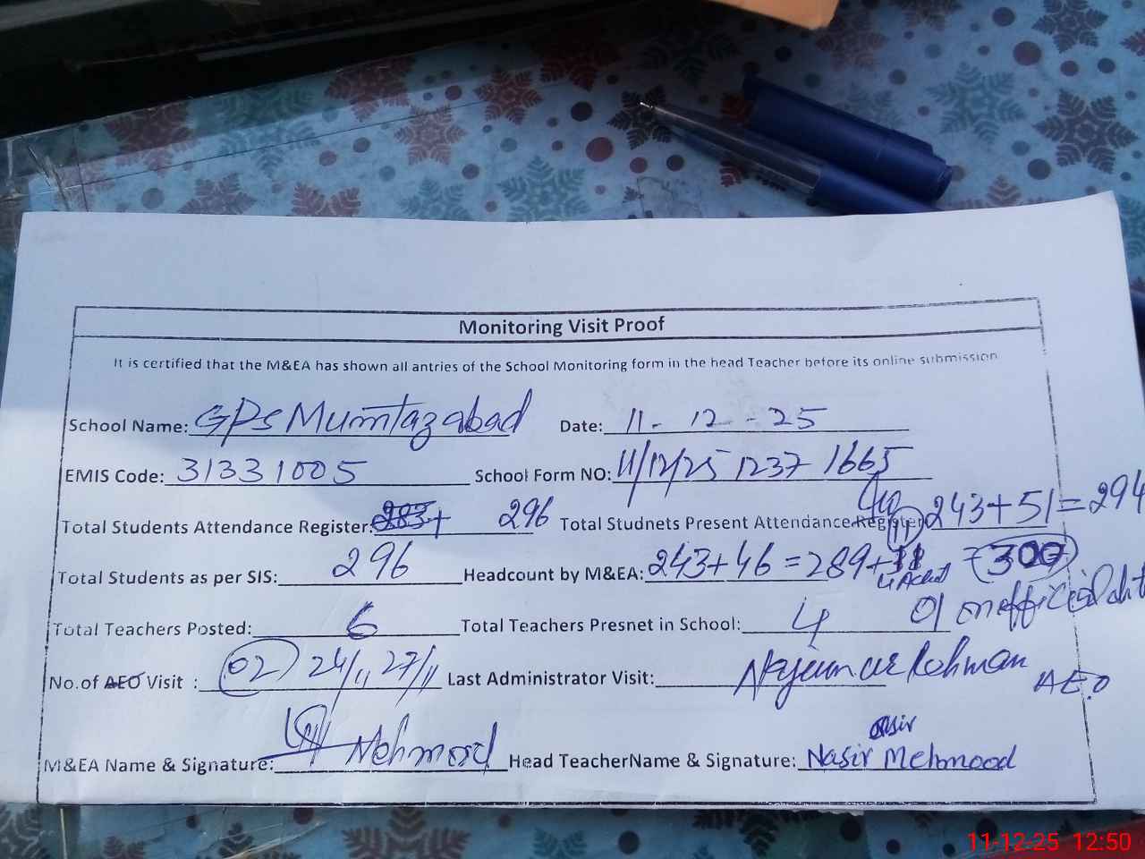 | EMIS Code: 31331005 | Name of School: GPS MUMTAZ ABAD | |||