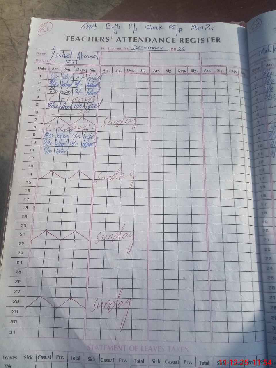 | CNIC | Full Name | Designation | R/C | Absence During Last Calender Month |