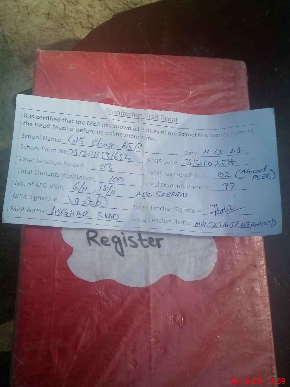 | Attendance Register | Head Teacher | MEA with School | Visit Proof |