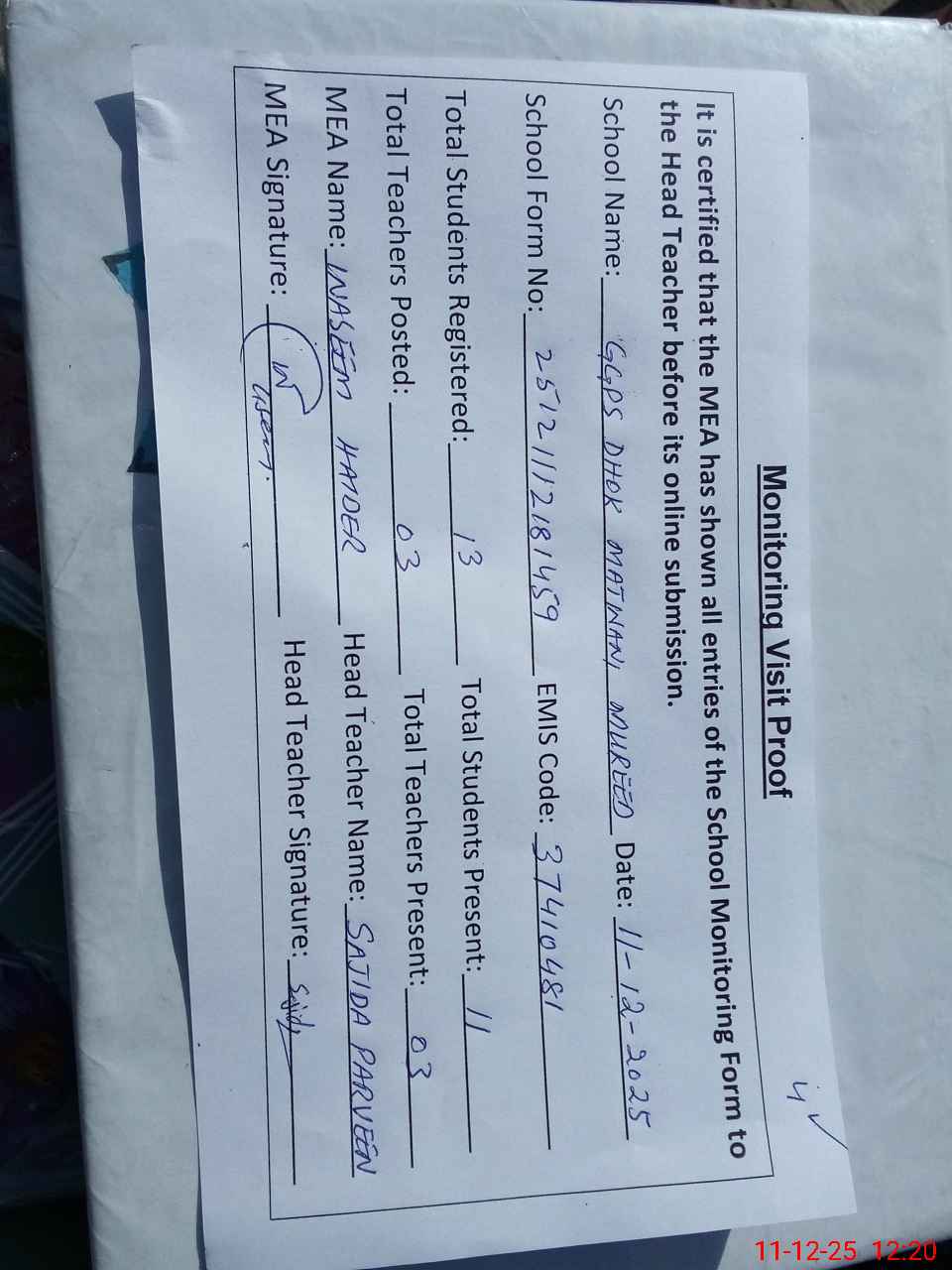 | EMIS Code: 37410481 | Name of School: GGPS DHOK MATWANI MEKHDOOM PUR SHARIF | |||