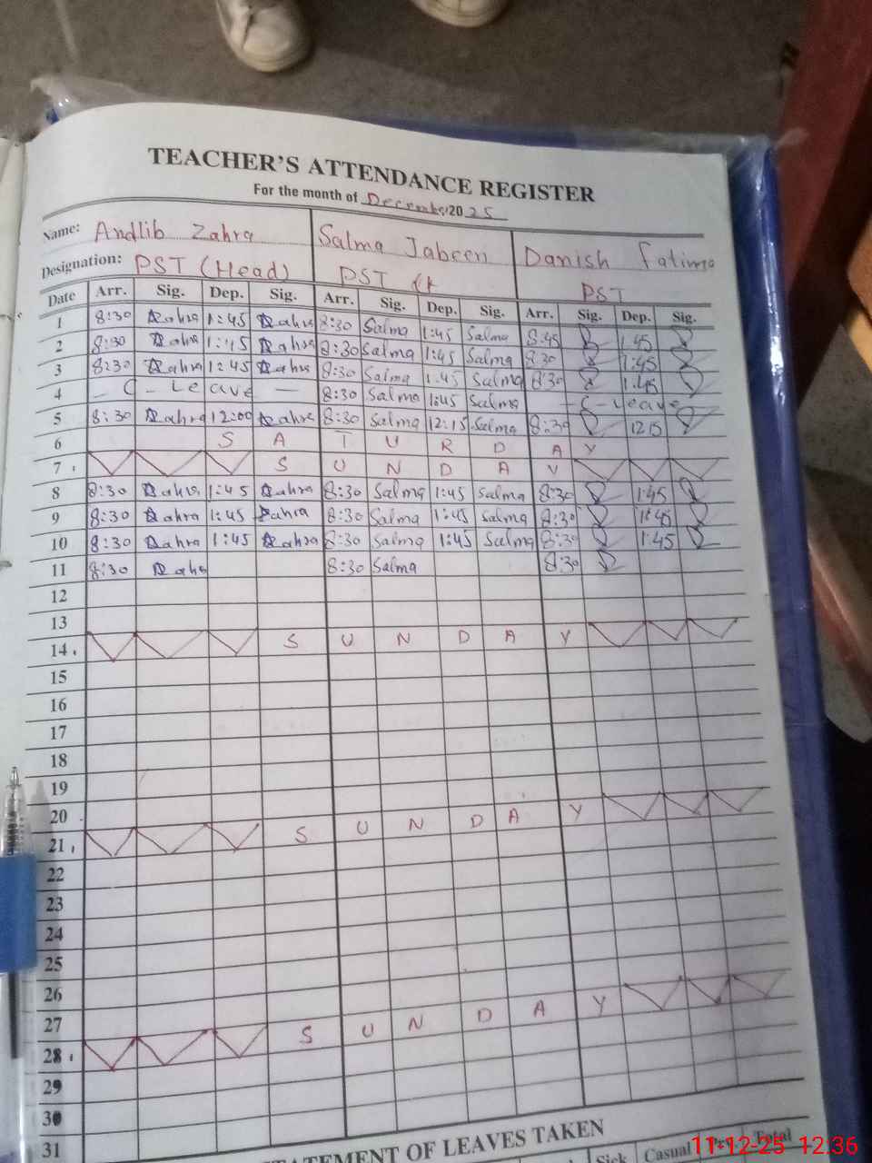 | Leave | Duty | Absent | Maternity | Medical | Ex- Pak |