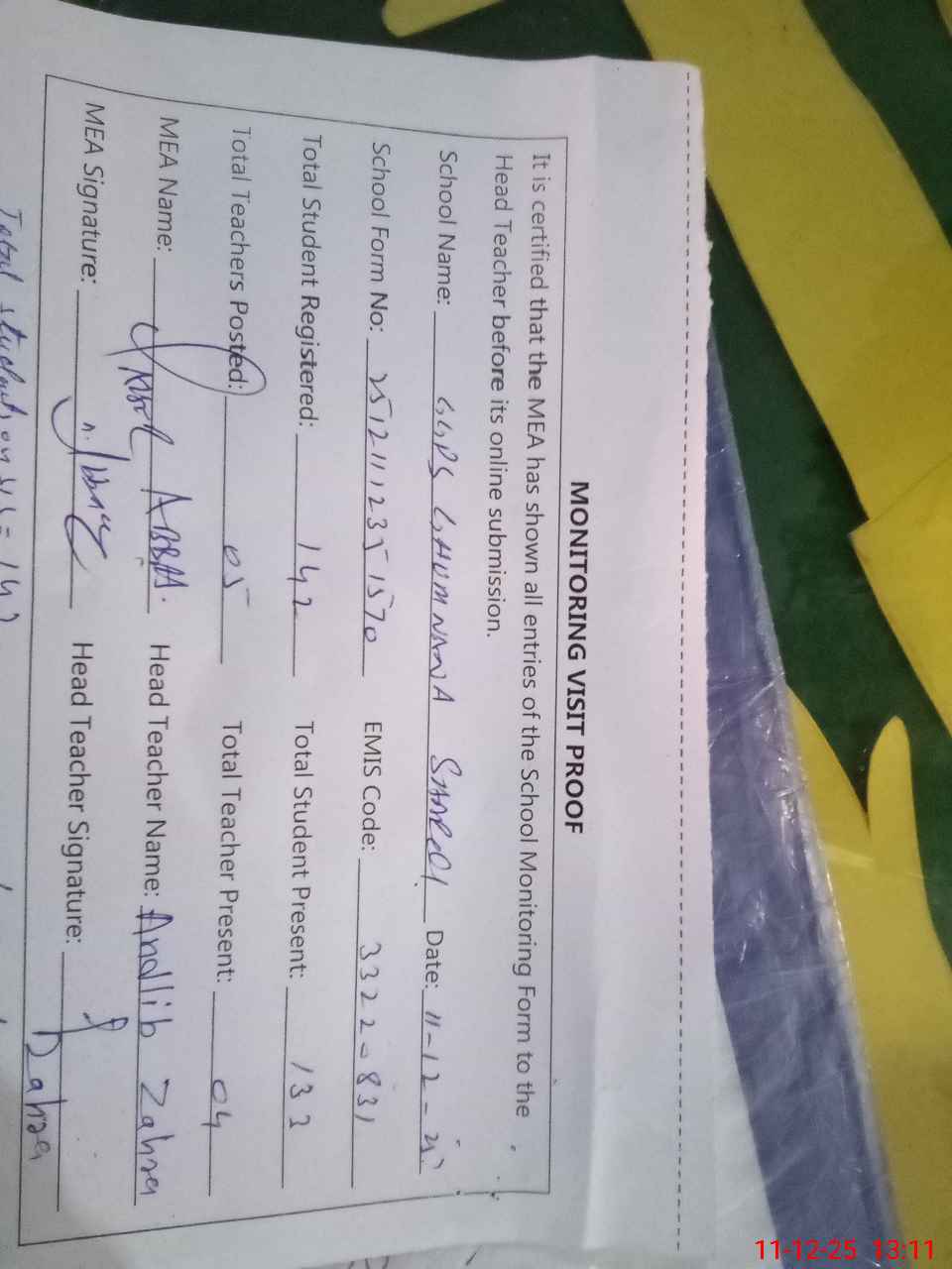| Attendance Register | Head Teacher | MEA with School | Visit Proof |
