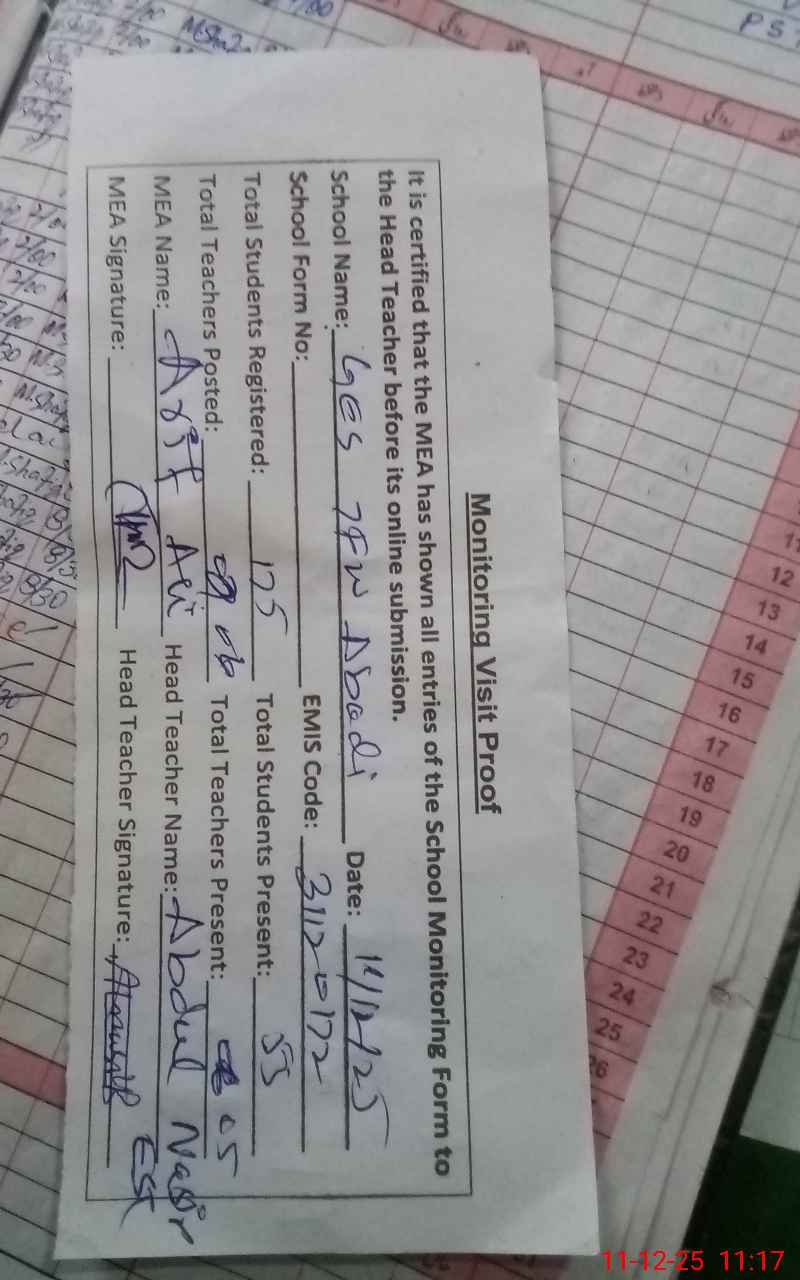 | Attendance Register | Head Teacher | MEA with School | Visit Proof |