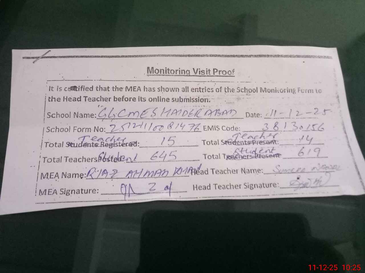 | Attendance Register | Head Teacher | MEA with School | Visit Proof |
