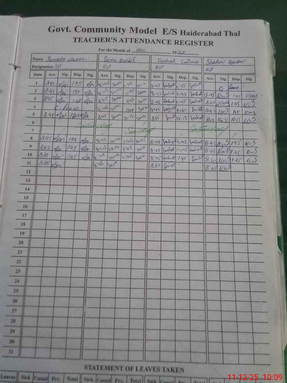 | CNIC | Full Name | Designation | R/C | Absence During Last Calender Month |