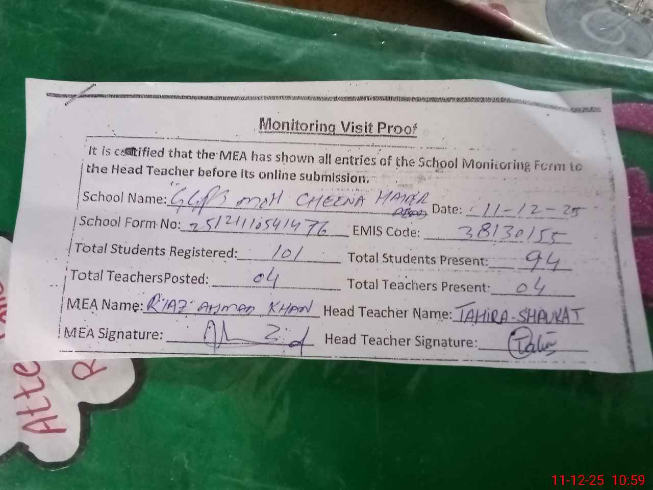 | Attendance Register | Head Teacher | MEA with School | Visit Proof |