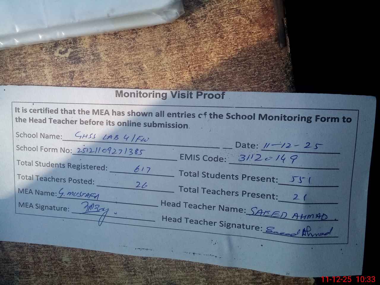 | EMIS Code: 31120149 | Name of School: GHSS LABORATORY 4/FW (ATTACH WITH QAED) CHISHTIAN | |||