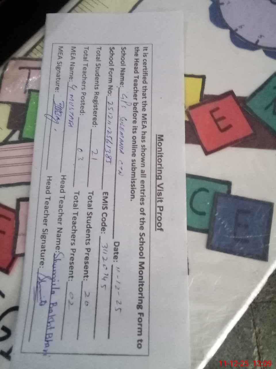 | Attendance Register | Head Teacher | MEA with School | Visit Proof |