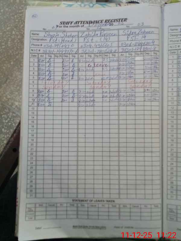 | CNIC | Full Name | Designation | R/C | Absence During Last Calender Month |