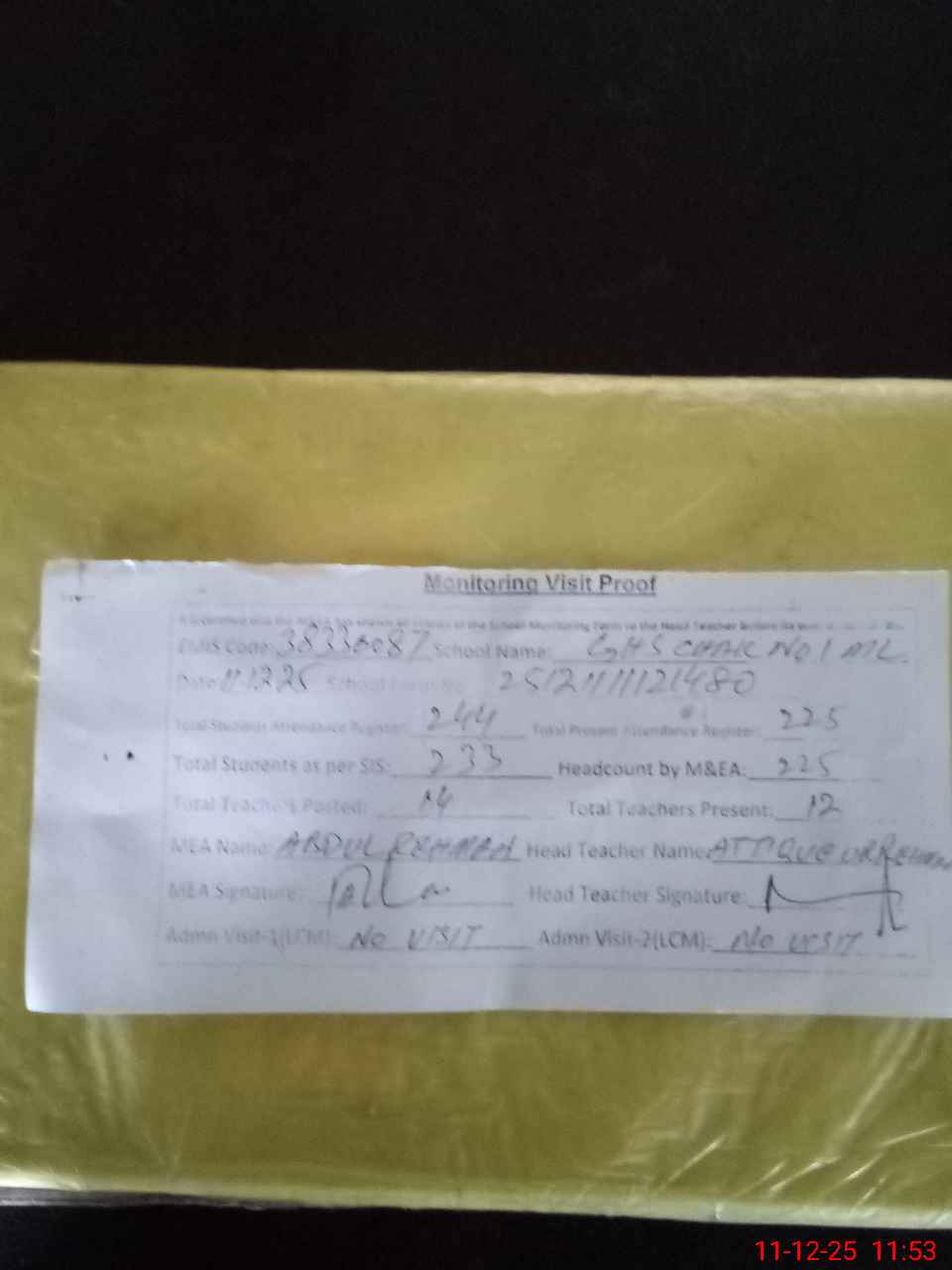 | Attendance Register | Head Teacher | MEA with School | Visit Proof |