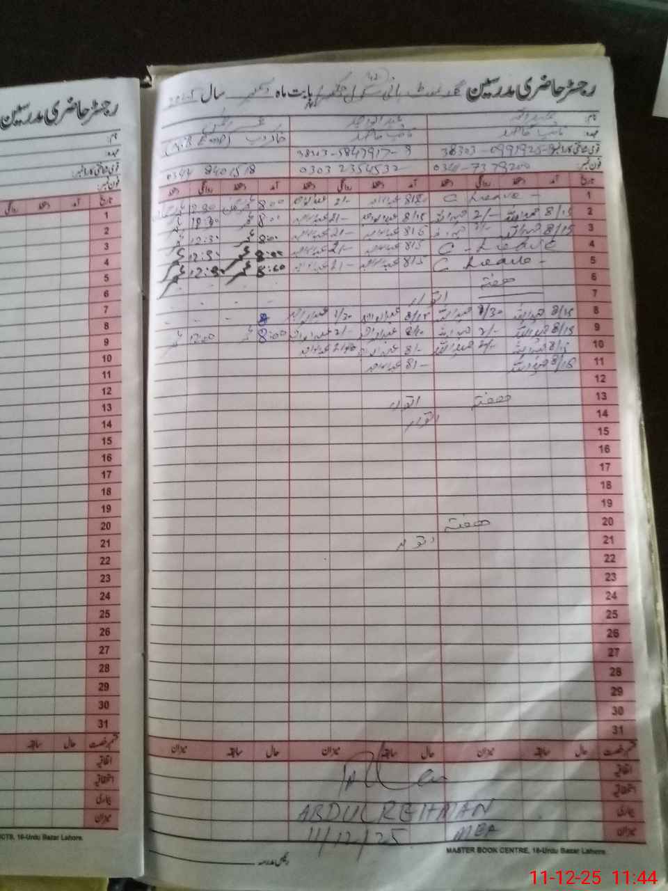 | CNIC | Full Name | Designation | R/C | Absence During Last Calender Month |