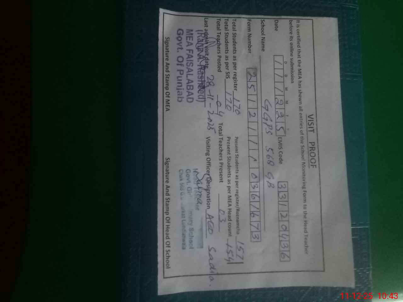 | EMIS Code: 33120436 | Name of School: GGPS CHAK 568 GB LUNDIANWALA | |||