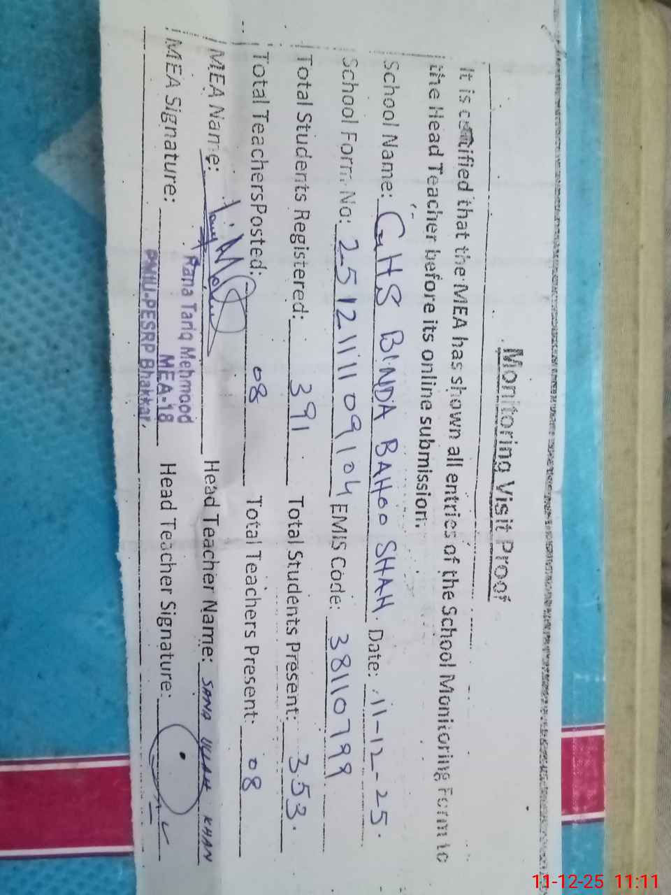 | EMIS Code: 38110799 | Name of School: GHS BINDA BAHOO SHAH | |||