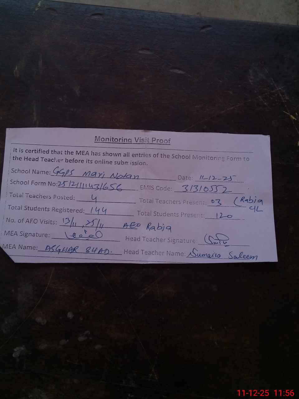| Monitoring Date: 11-12-2025 | Start Time: 11-12-2025 11:28 AM | End Time: 11-12-2025 11:56 AM | Name of MEA: Mu**** As**** Sh**** | |