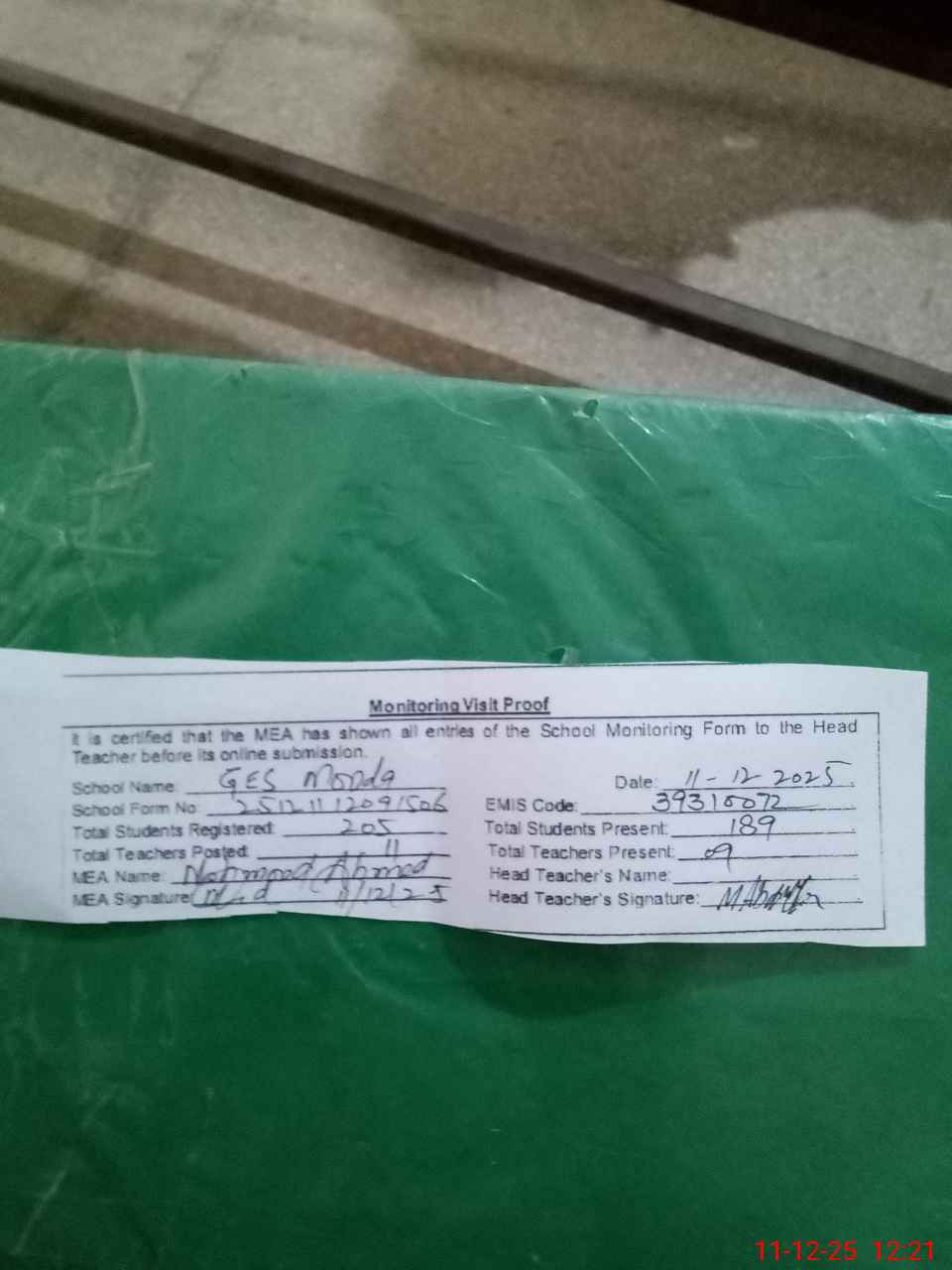 | Attendance Register | Head Teacher | MEA with School | Visit Proof |