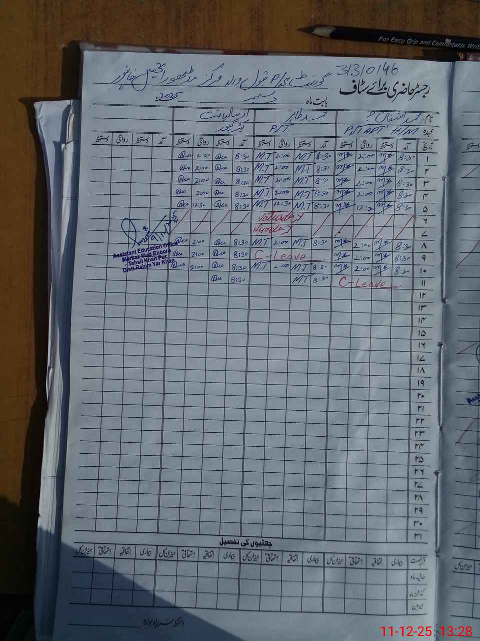 | CNIC | Full Name | Designation | R/C | Absence During Last Calender Month |