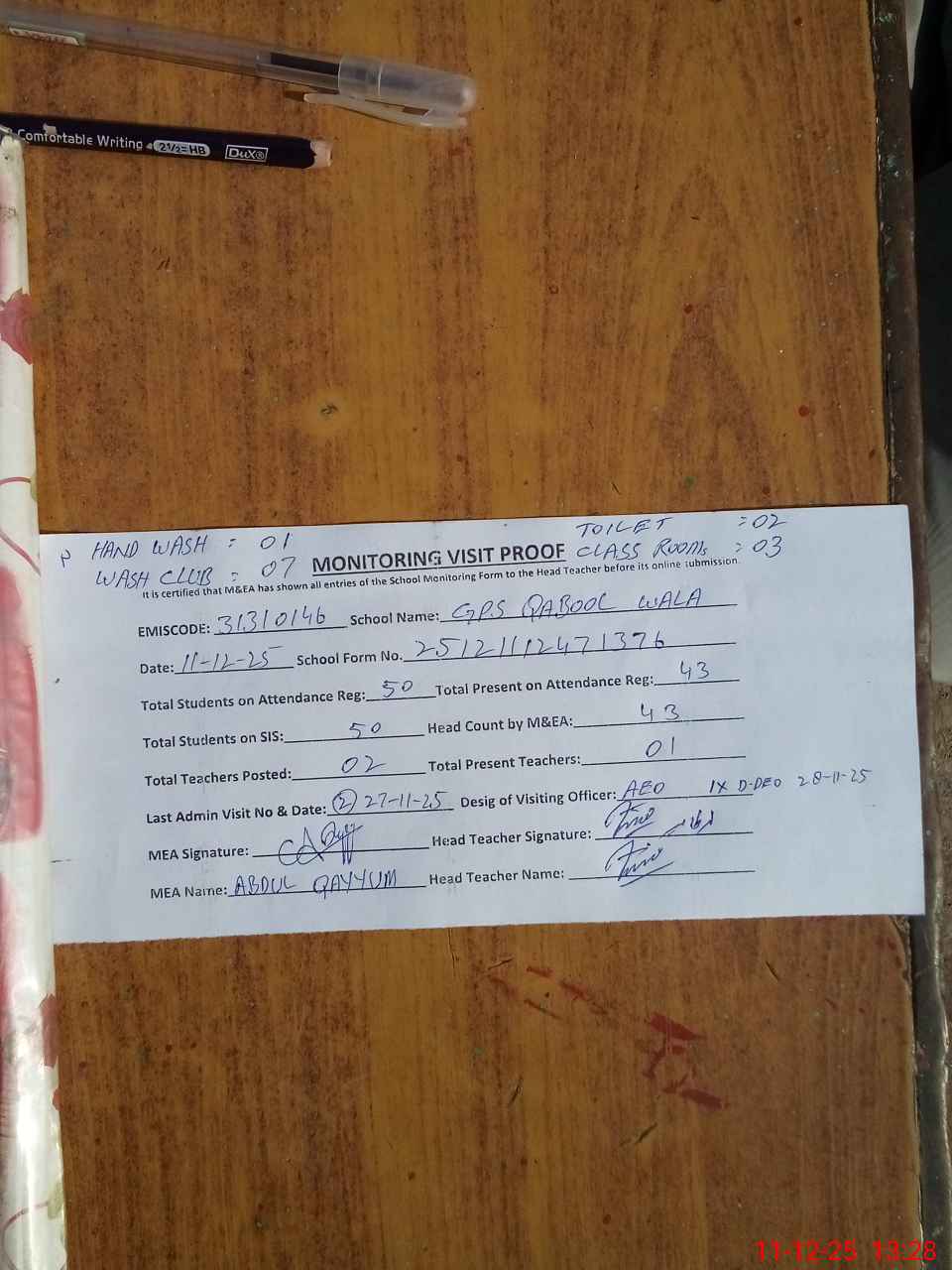 | Attendance Register | Head Teacher | MEA with School | Visit Proof |