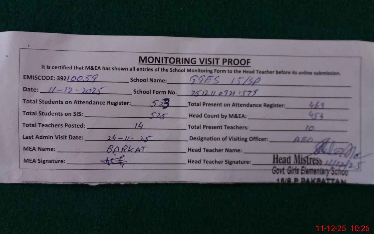 | Attendance Register | Head Teacher | MEA with School | Visit Proof |