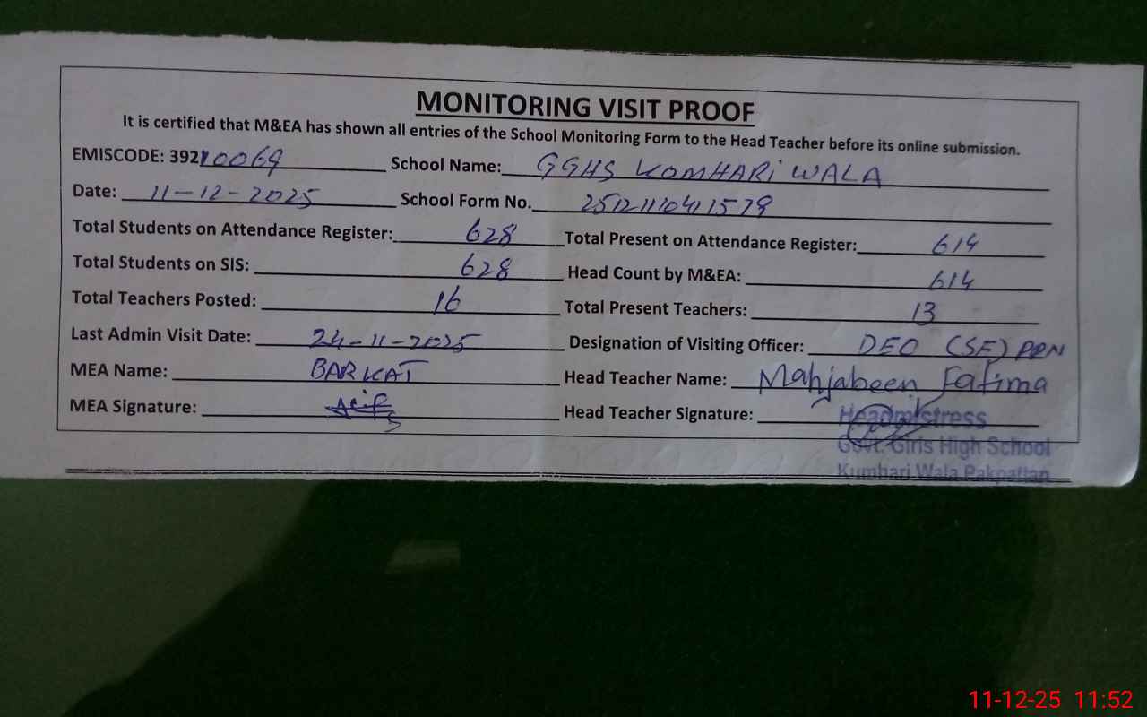 | EMIS Code: 39210069 | Name of School: GGHS KOMHARI WALA | |||