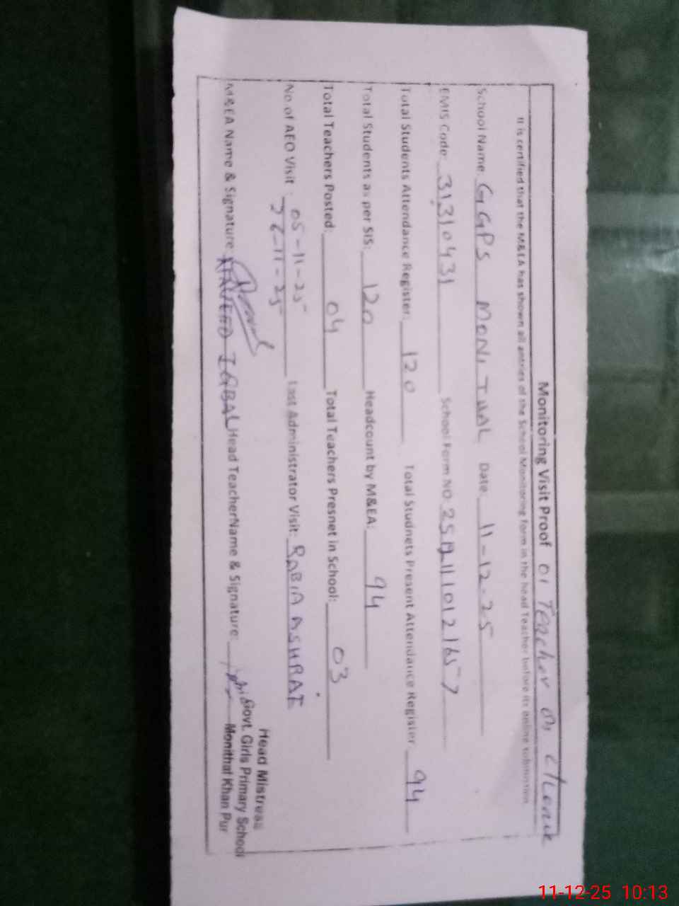 | Attendance Register | Head Teacher | MEA with School | Visit Proof |