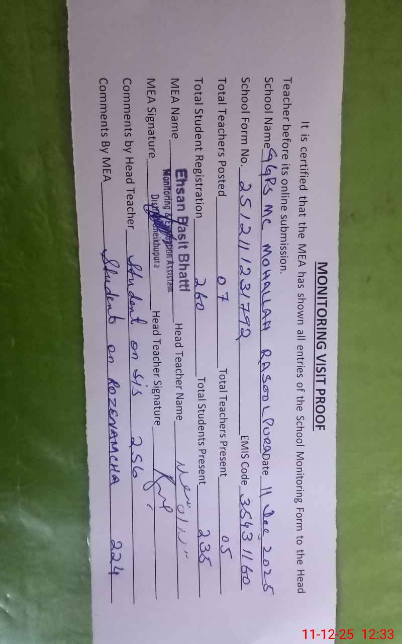 | EMIS Code: 35431160 | Name of School: GGPS MC MOHALLA RASOOL PURA | |||