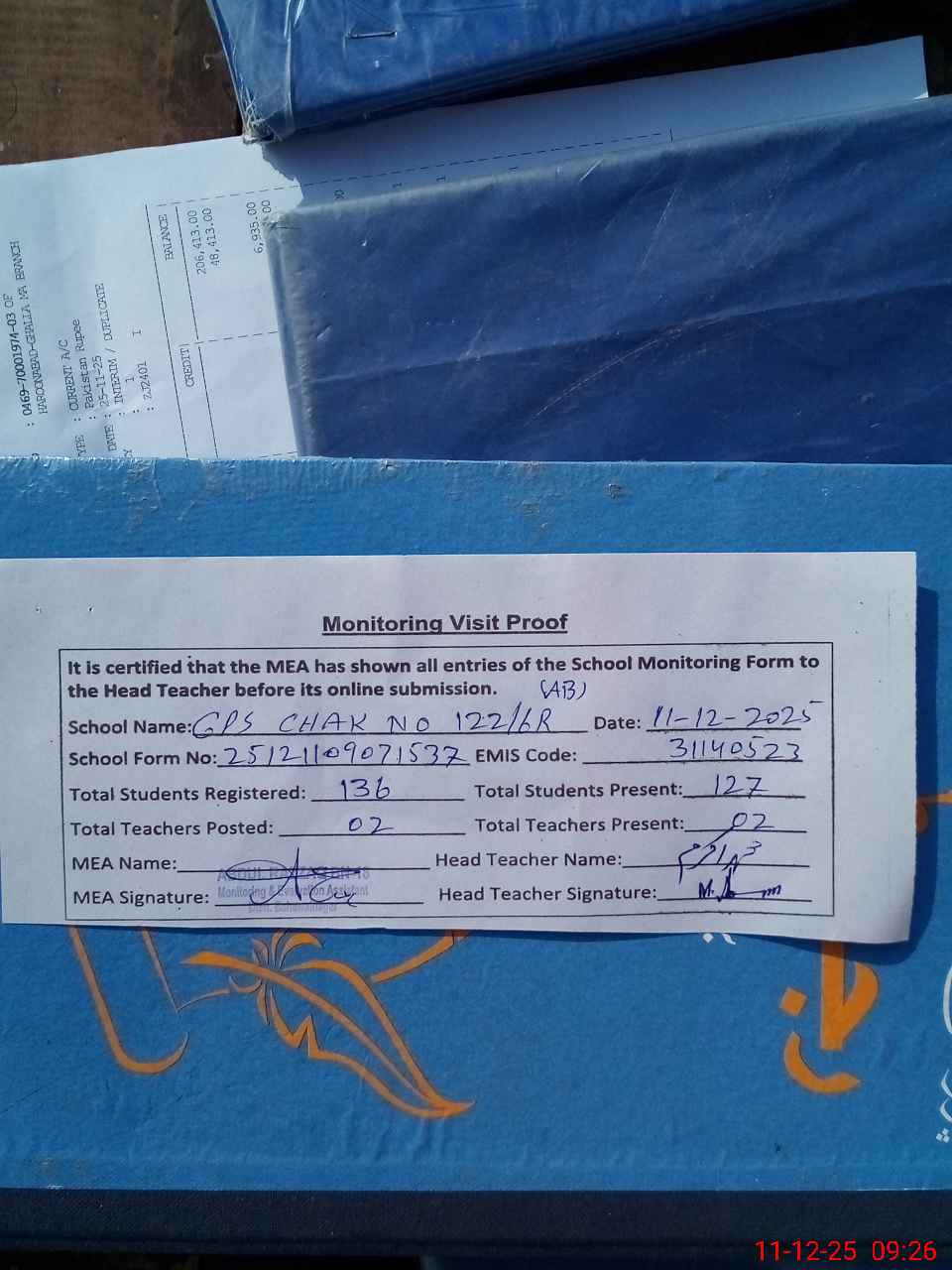 | Attendance Register | Head Teacher | MEA with School | Visit Proof |