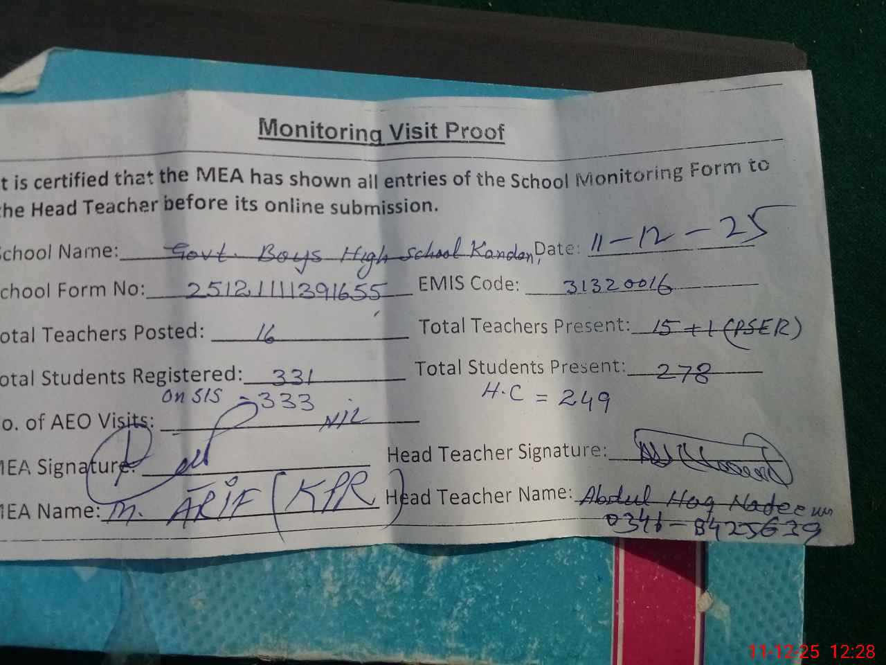 | Attendance Register | Head Teacher | MEA with School | Visit Proof |