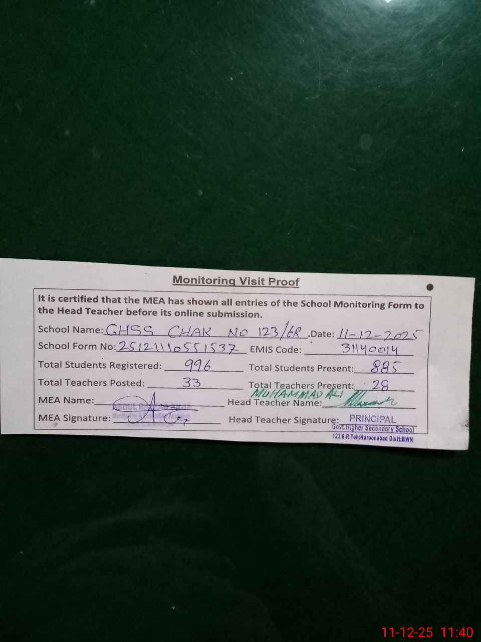 | Attendance Register | Head Teacher | MEA with School | Visit Proof |