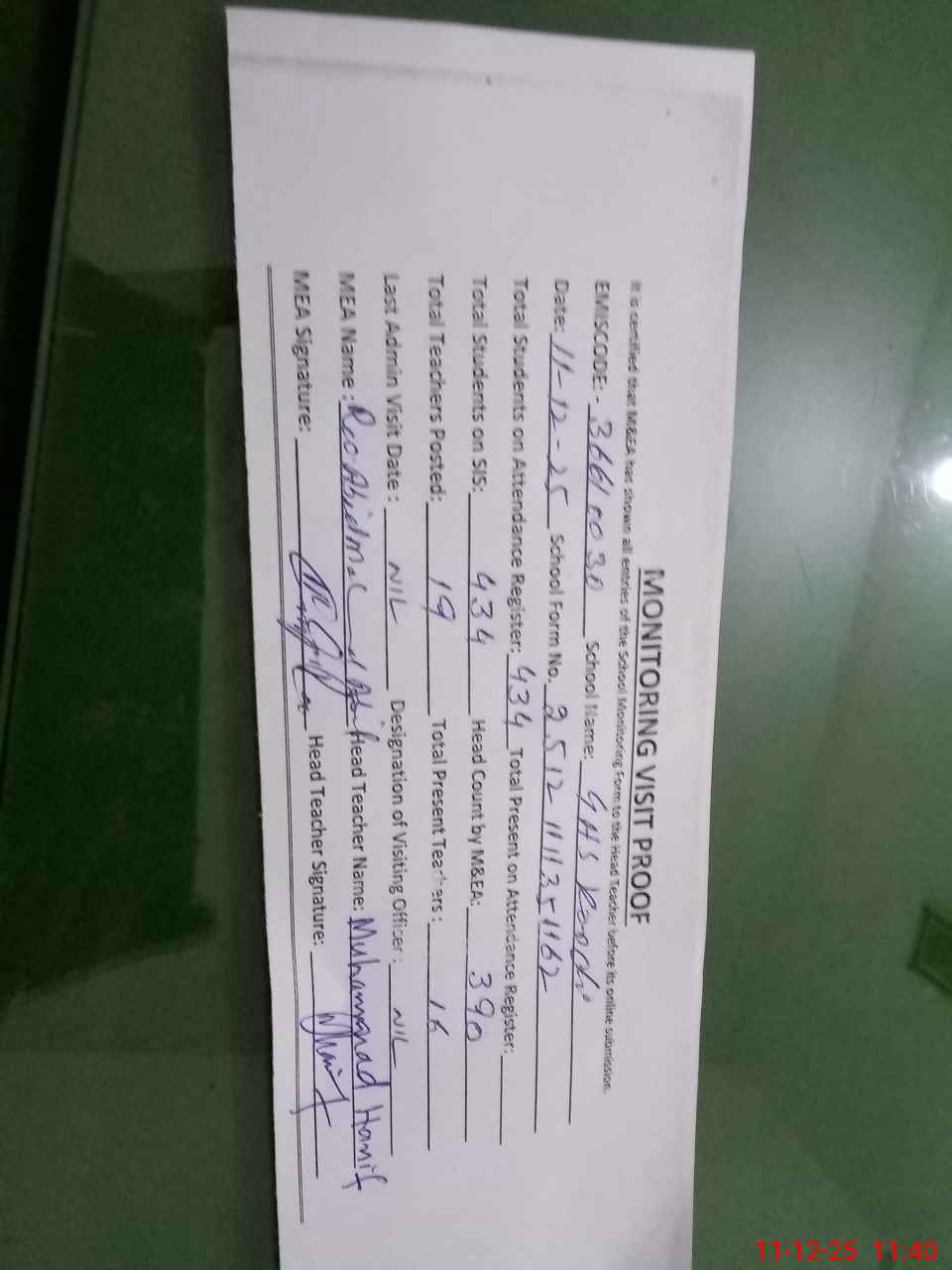 | Attendance Register | Head Teacher | MEA with School | Visit Proof |