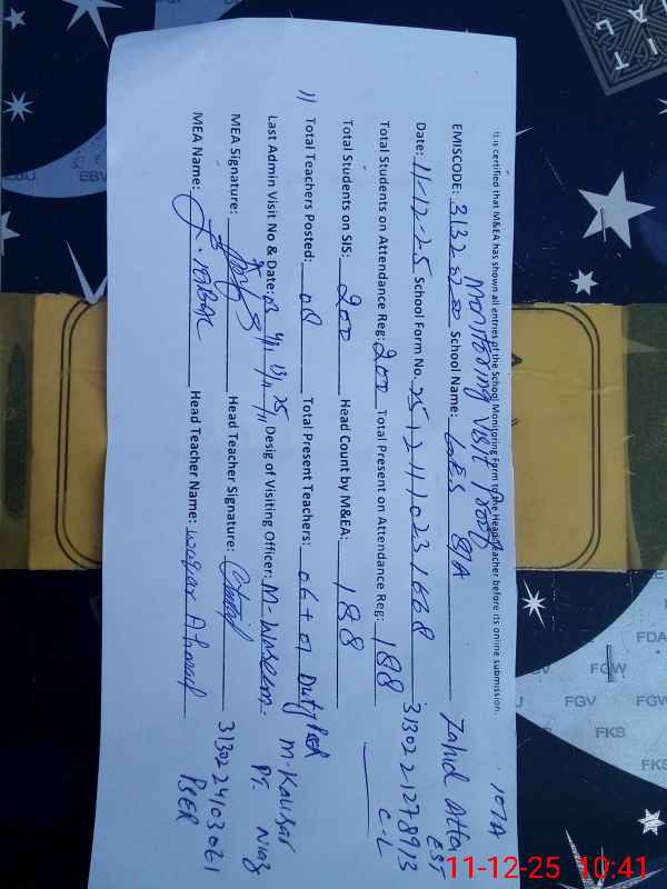 | Monitoring Date: 11-12-2025 | Start Time: 11-12-2025 10:23 AM | End Time: 11-12-2025 10:47 AM | Name of MEA: Za**** Iq**** | |