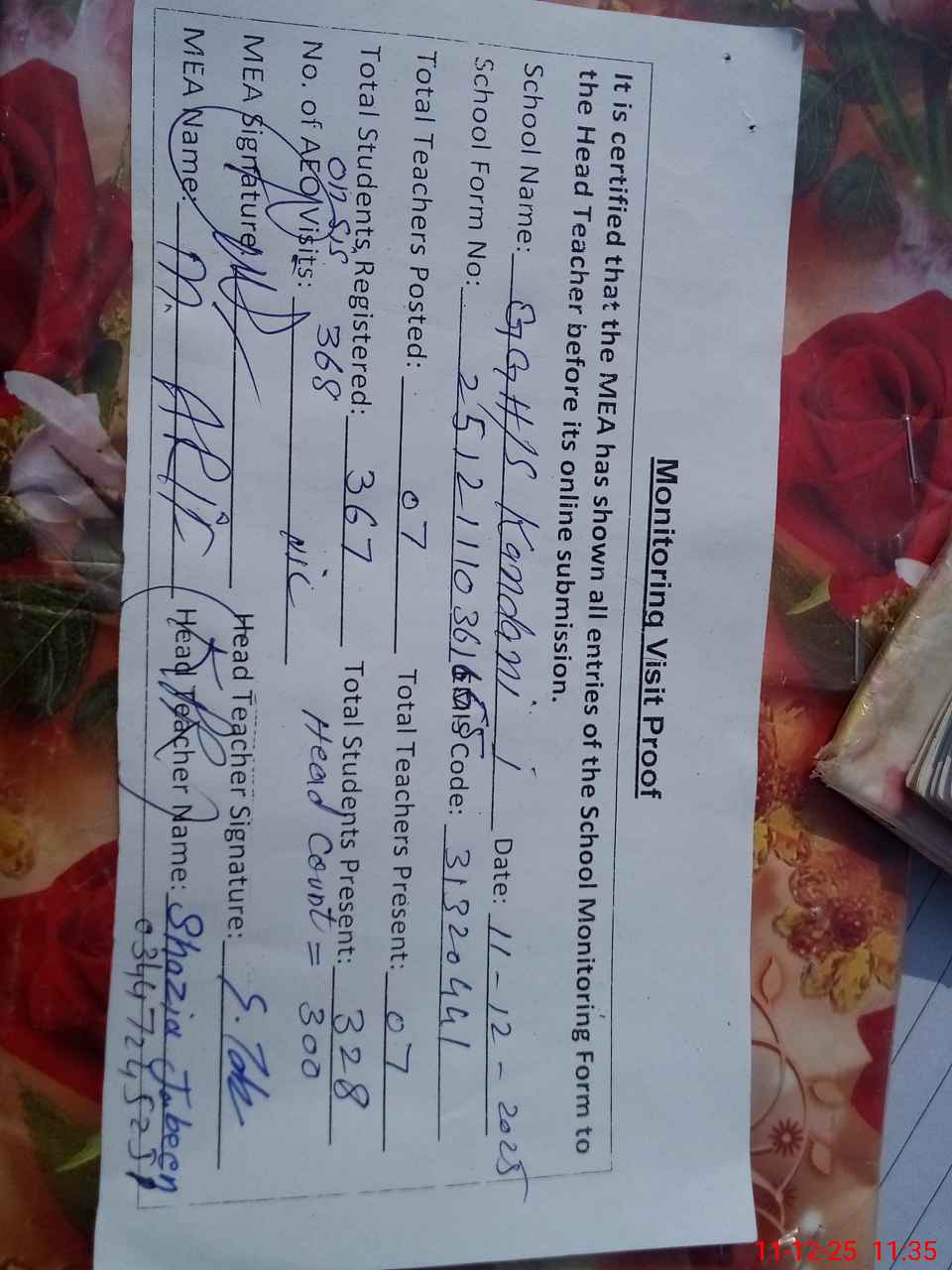 | Attendance Register | Head Teacher | MEA with School | Visit Proof |