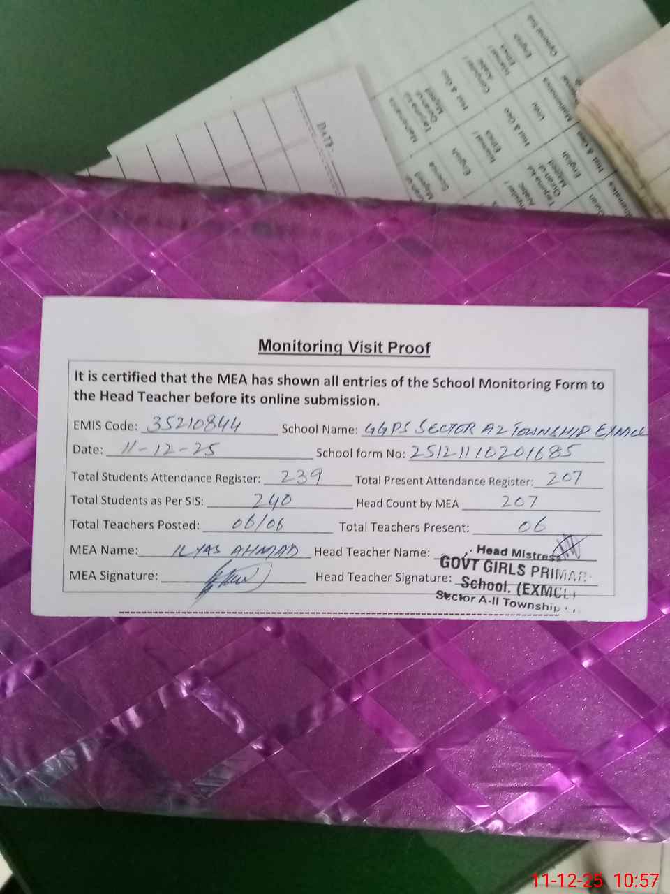 | EMIS Code: 35210844 | Name of School: GGPS SECTOR A-II TOWNSHIP (EX-MCL) | |||