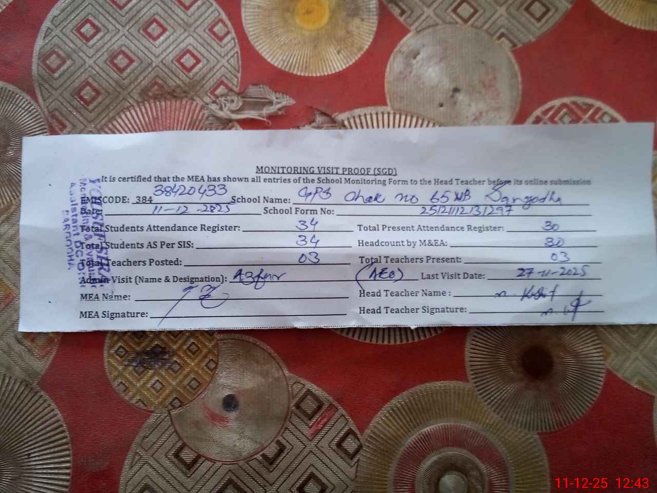 | Attendance Register | Head Teacher | MEA with School | Visit Proof |