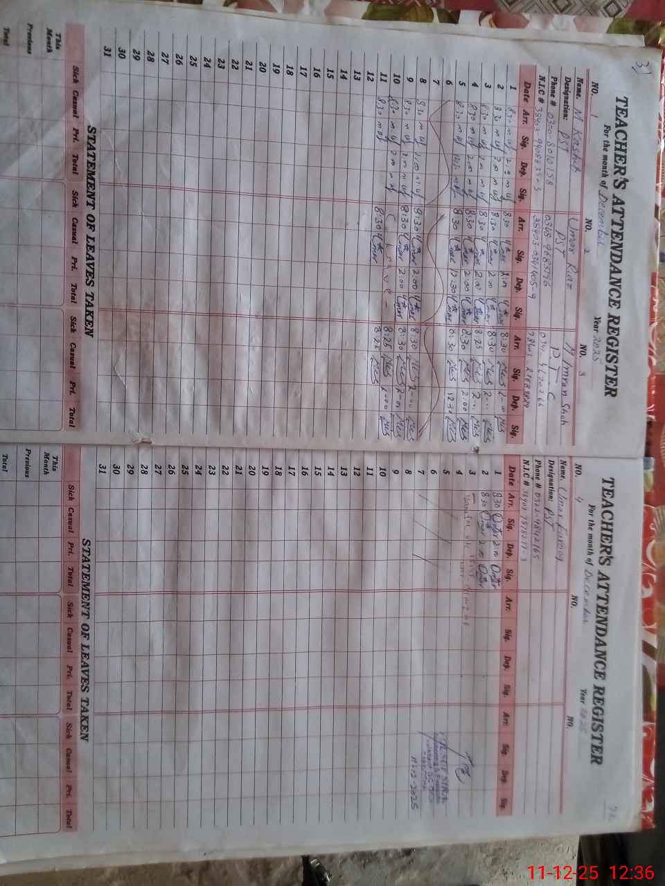 | CNIC | Full Name | Designation | R/C | Absence During Last Calender Month |