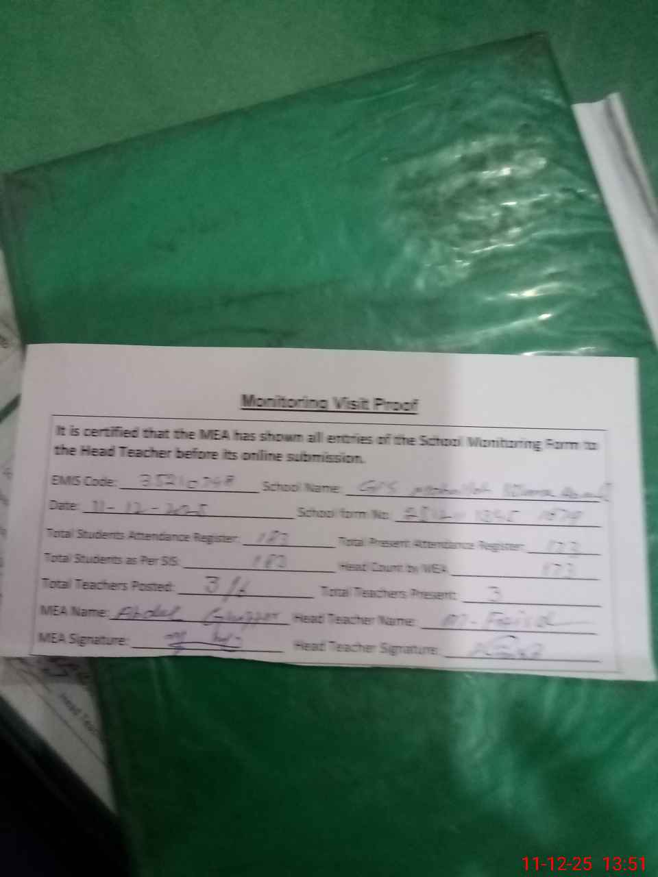 | Attendance Register | Head Teacher | MEA with School | Visit Proof |