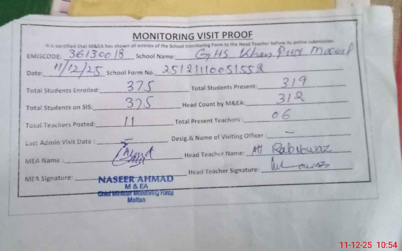 | EMIS Code: 36130018 | Name of School: GHS KHAN PUR MARAL VIA MAKHDOOM RASHID MULTAN | |||