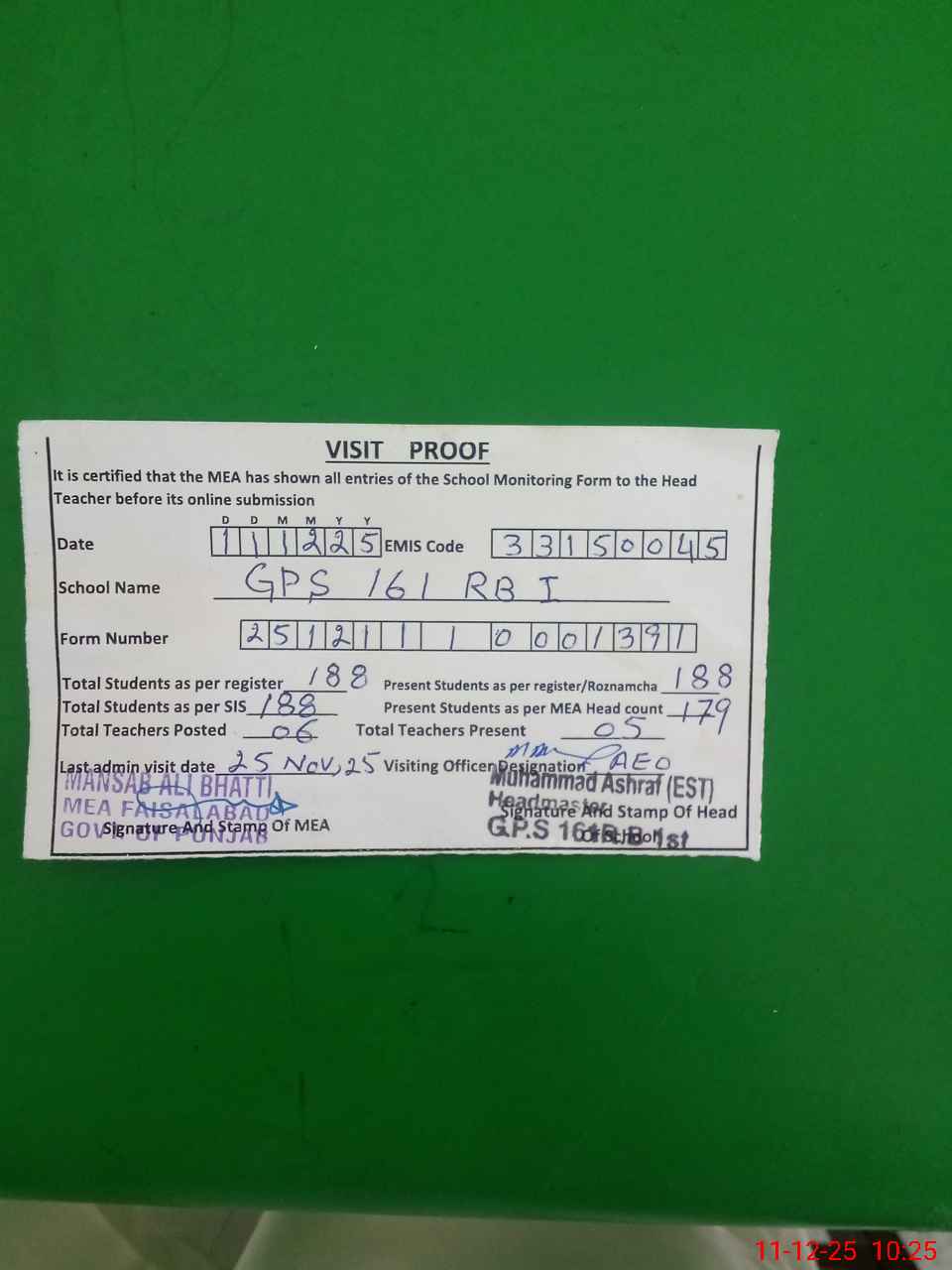 | Monitoring Date: 11-12-2025 | Start Time: 11-12-2025 09:37 AM | End Time: 11-12-2025 10:28 AM | Name of MEA: Ma**** Al**** | |