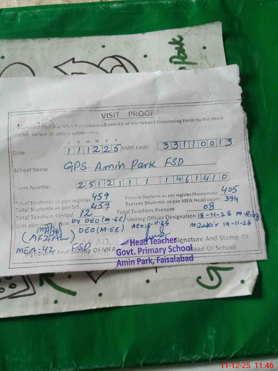 | Attendance Register | Head Teacher | MEA with School | Visit Proof |