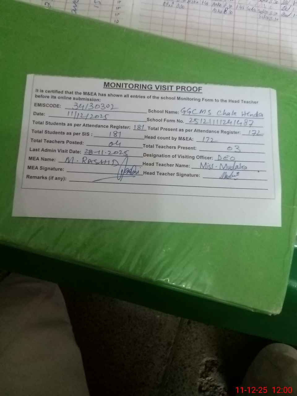 | EMIS Code: 34130302 | Name of School: GGCMS CHAK HINDA | |||