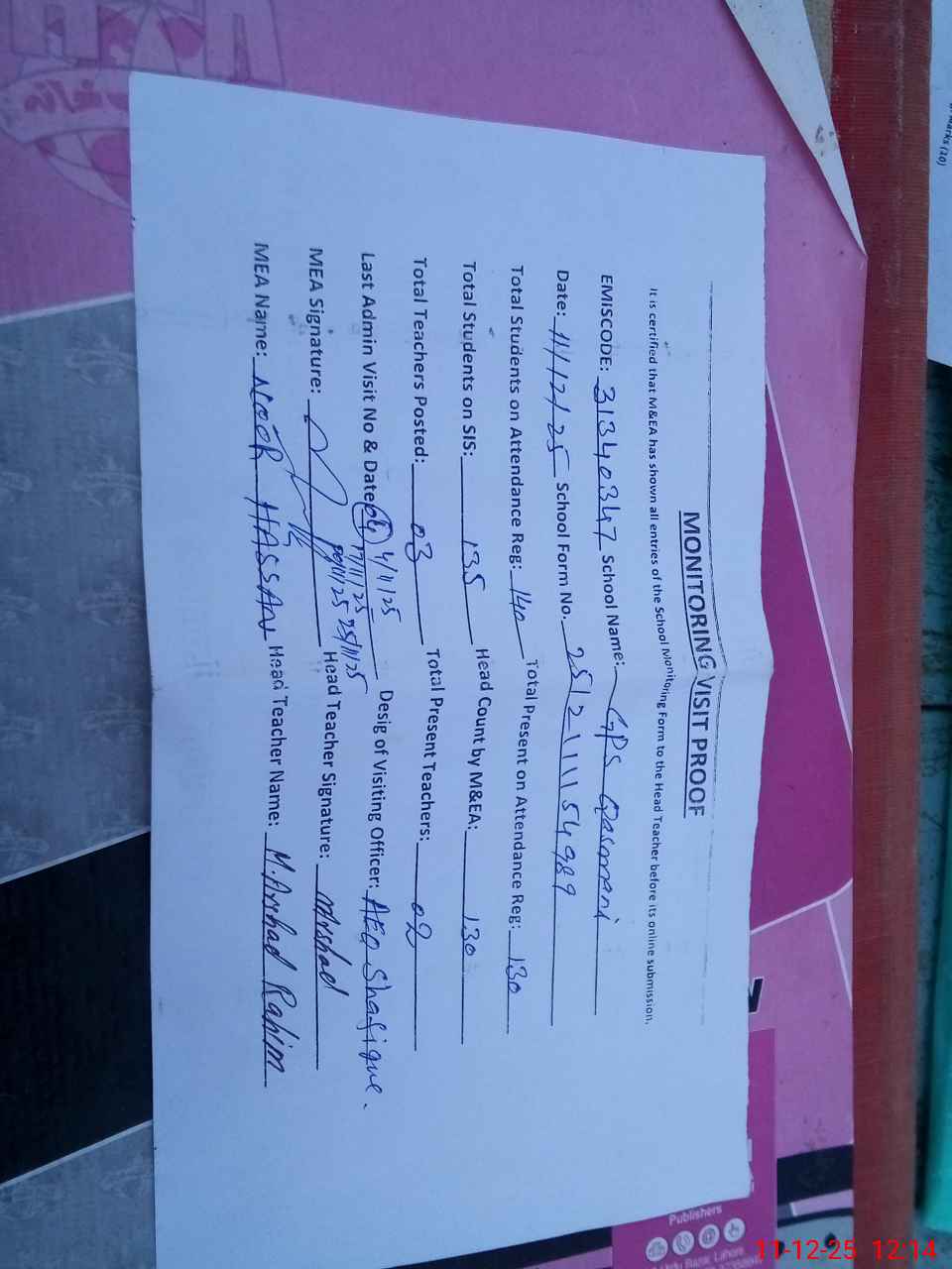 | Attendance Register | Head Teacher | MEA with School | Visit Proof |