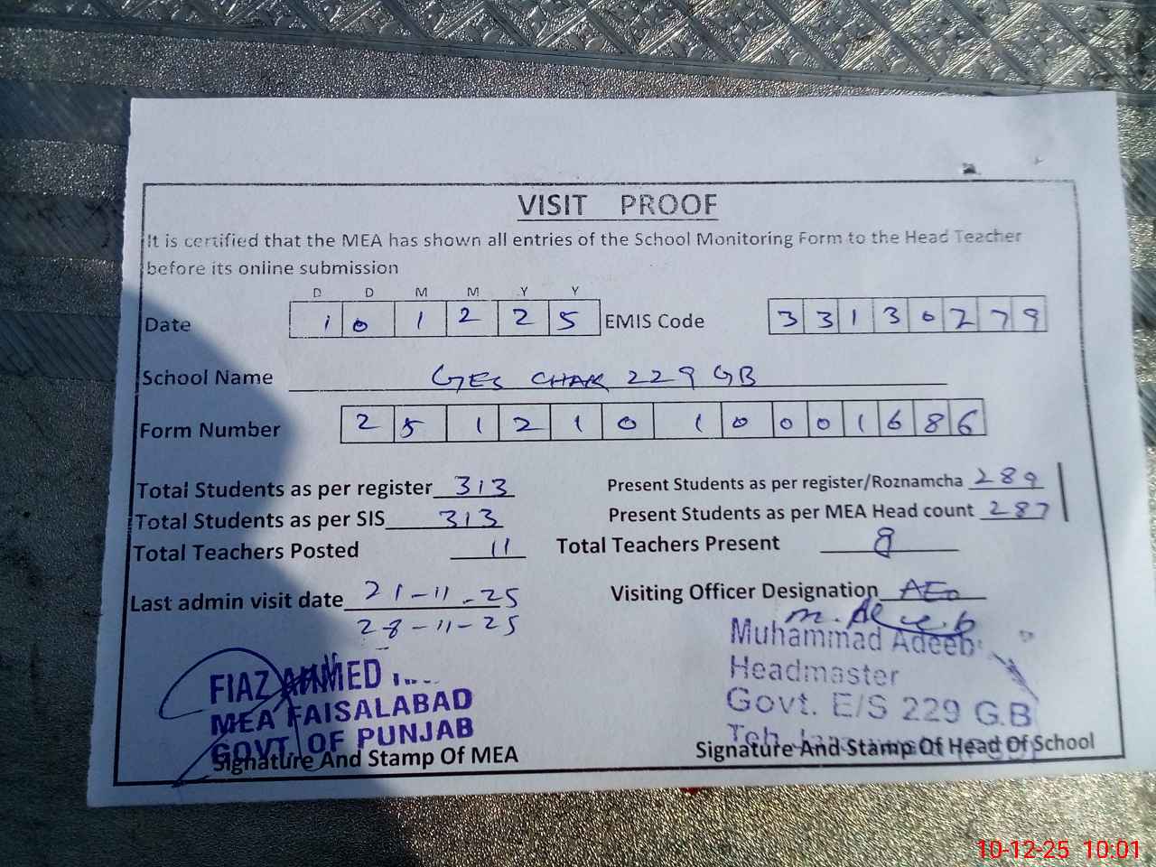 | EMIS Code: 33130279 | Name of School: GES CHAK NO.229/GB | |||