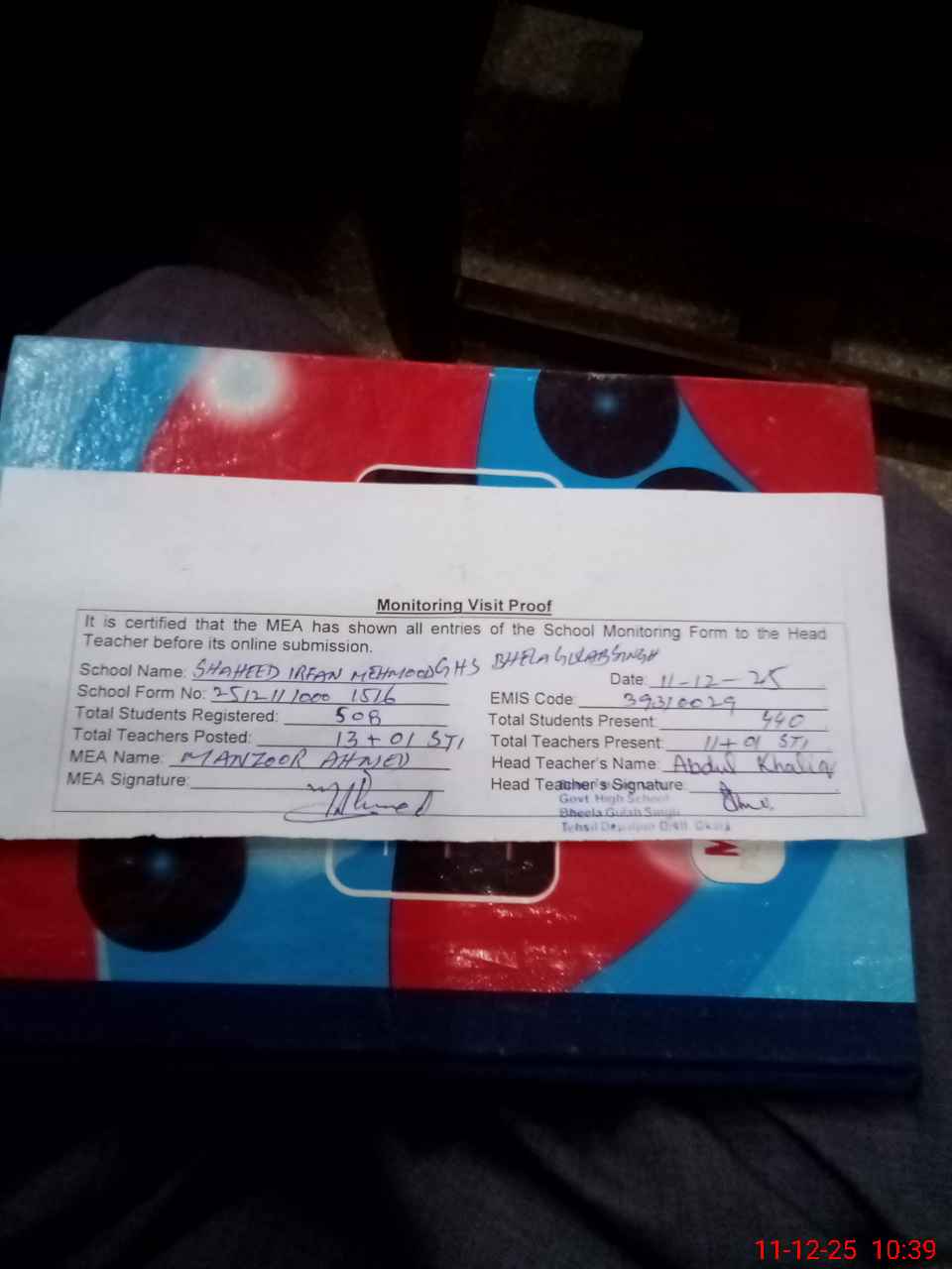 | Attendance Register | Head Teacher | MEA with School | Visit Proof |