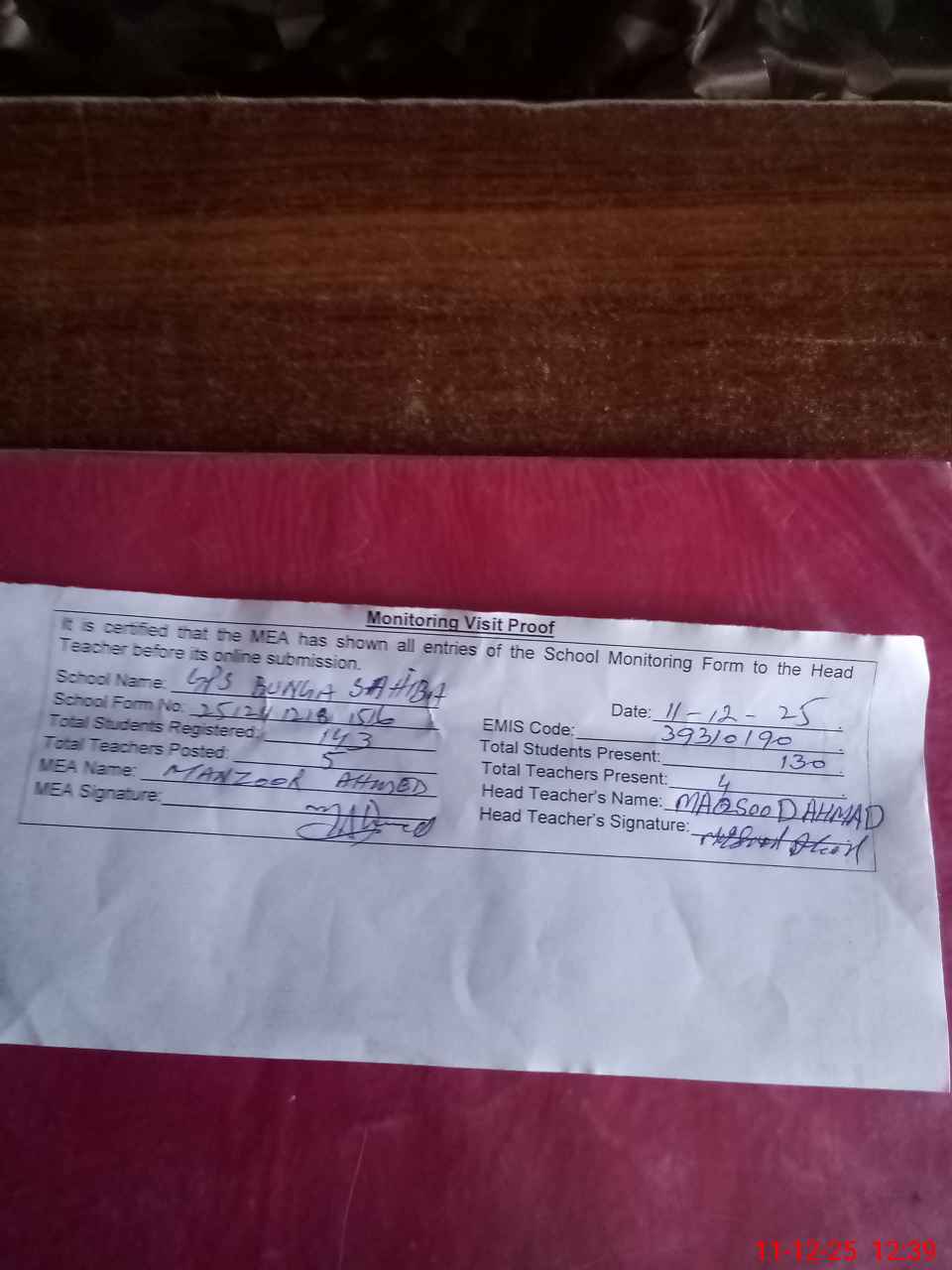 | Attendance Register | Head Teacher | MEA with School | Visit Proof |